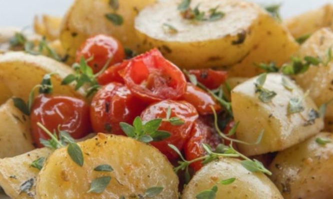 Σε ένα μικρό ταψί βάζετε τις ροδέλες κρεμμυδιού από επάνω τις πατάτες και τελευταίες τις ντομάτες.