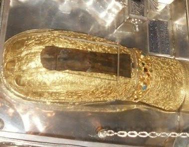 – Αύριο που θα προσκυνήσετε μετά τη θεία λειτουργία, παρατηρήστε μία μικρή πληγή στην πάνω πλευρά του χεριού. Σα να λείπει ένα μικρό κομμάτι. Οι ρώσοι μοναχοί στις αρχές του εικοστού αιώνα, που είχε πολλούς τότε το Άγιον Όρος, το είχαν σε μεγάλη ευλάβεια. Κάποιοι από αυτούς, όπως το ασπάζονταν, το δάγκαναν κρυφά και έκοβαν ένα μικρό κομματάκι, μια ακίδα, για ευλογία. Το έκρυβαν στο στόμα τους. Μέχρι να τους πάρουν είδηση οι μοναχοί τότε της μονής, είχε γίνει μια μικρή πληγή.