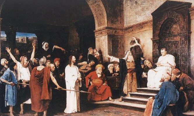 Αρνείται να παρατάξει τις λεγεώνες των αγγέλων για να αποφύγει το θάνατο. Αρνείται να συντρίψει ως «σκεύη κεραμέως» τους σπιθαμιαίους εκείνους που γελοιοποιούν κάθε κριτήριο και της ανθρώπινης δικαιοσύνης. Απαντά με την σιωπή και την γαλήνη στην αποθέωση του συμφέροντος που χαρακτηρίζει τον φαινομενικά ισχυρό διοικητή, καθώς αυτός νίπτει τας χείρας του, για να μην χάσει την ησυχία του.