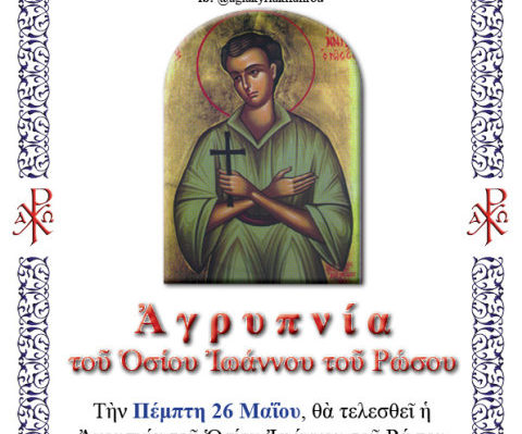 Στον Ι. Ναό Αγίας Κυριακής Αμφιθέας, της Μητροπόλεως Νέας Σμύρνης, την Πέμπτη, 26 Μαΐου 2022, θα τελεστεί Αγρυπνία, από 21:00 – 00:45 π.μ., προς τιμήν του Οσίου Ιωάννου του Ρώσου.