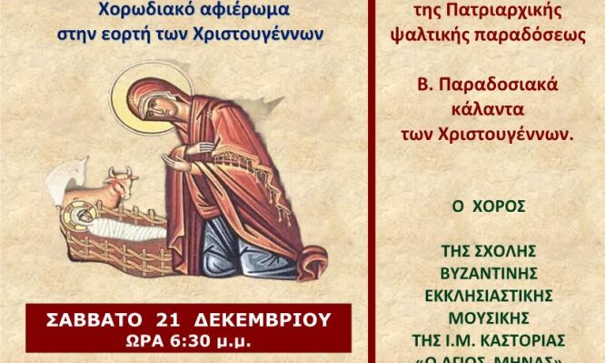 Τους ύμνους και τα κάλαντα θα ερμηνεύσει η χορωδία της Σχολής Βυζαντινής Εκκλησιαστικής Μουσικής της Ιεράς Μητροπόλεως Καστοριάς «ο Άγιος Μηνάς».