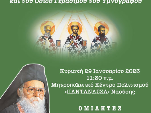 Η Εορτή των Γραμμάτων προς τιμήν των Τριών Ιεραρχών, θα πραγματοποιηθεί την Κυριακή 29 Ιανουαρίου 2023 και ώρα 11:30 π.μ. στο Μητροπολιτικό Κέντρο Πολιτισμού ΠΑΝΤΑΝΑΣΣΑ Ναούσης (έναντι του Ιερού Ναού Παναγίας).