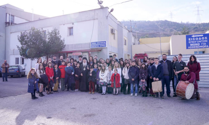 Τον Σεβασμιώτατο συνόδευσε μία ομάδα νέων από τις κατηχητικές συνάξεις Αλεξάνδρειας που έψαλλαν τα πρωτοχρονιάτικα κάλαντα και μοίρασαν επίσης δώρα.