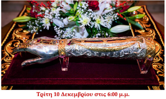 Η δεξιά χείρα του Αγίου Γερασίμου του Υμνογράφου στον Άγιο Λουκά τον Ιατρό στην Παναγία Δοβρά το εσπέρας της Τρίτης, 10ης Δεκεμβρίου.