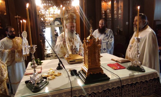 Ο Μητροπολίτης χοροστάτησε κατά τον Όρθρο και προεξήρχε στην Θεία Λειτουργία, όπου χειροθέτησε Αναγνώστη τον μαθητή Λυκείου κ. Θεολόγο Πατεράκη, στον οποίο επεσήμανε την σπουδαιότητα της σχέσης του χριστιανού με τα ιερά αναγνώσματα, με τα οποία ο Θεολόγος ασχολείται από βρέφους κοντά στον Ιερέα Πατέρα του και την καλλιεργημένη στην Πίστη μητέρα του.