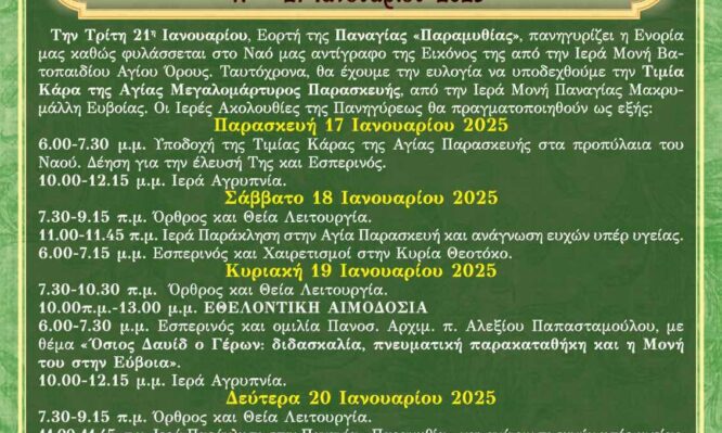 Την Κάρα της Αγίας Παρασκευής θα υποδεχθεί ο Ι. Ναός Αγίας Μαρίνης, στην Άνω Τούμπα Θεσσαλονίκης, σύμφωνα με το ακόλουθο Πρόγραμμα: