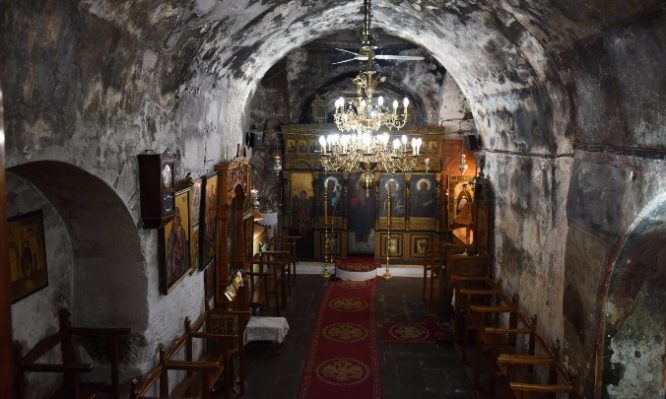 Παραμένοντας στην εντός των μεσαιωνικών τειχών περιοχή και κατευθυνόμενος ο επισκέπτης ανατολικά του ναού του Αγίου Φανουρίου, σε απόσταση 400μ, συναντάει τον τρίκλιτο καμαροσκέπαστο ναό της Αγίας Αικατερίνης, στον οποίο αναγνωρίζονται τέσσερις οικοδομικές φάσεις.