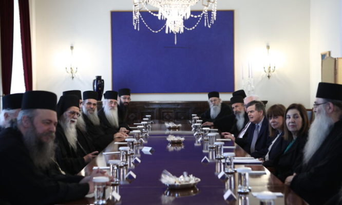 Η κυρία Σακελλαροπούλου ενημερώθηκε από τον Άγιο Πρωτεπιστάτη Γέροντα Χριστόφορο Ιβηρίτη, τον κ. Μαρτίνο και τους εκπροσώπους της Ιεράς Κοινότητας του Αγίου Όρους για θέματα που αφορούν την Αθωνική Πολιτεία.
