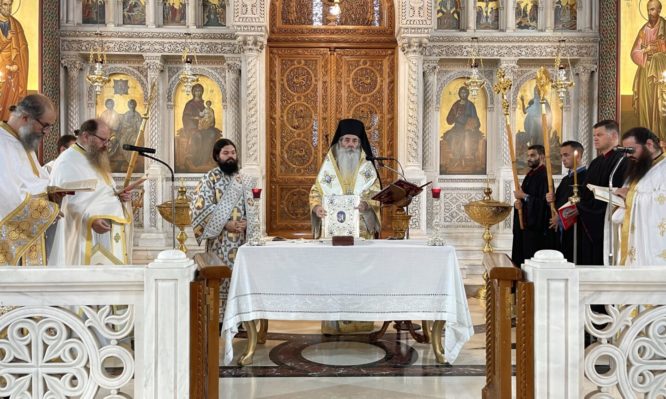 Κατά την διάρκεια του κηρύγματός του ο Σεβασμιώτατος αρχικά τόνισε πως σε αυτή την τρομακτική εποχή «των μεγάλων αναταράξεων και πνευματικών συγχύσεων», «σε αυτή την σκληρή εποχή των πολλών φόβων», έχουμε την μεγάλη ευλογία να τελούμε την Ευχαριστία στο όνομα του Θεού και ιδιαίτερα σήμερα μιας αρχαιοπρεπούς Θείας Λειτουργίας του Αγίου Ιακώβου του Αδελφοθέου.