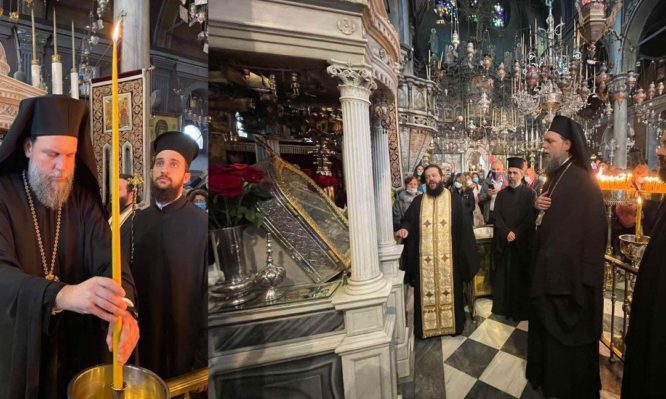 Κατά την επίσκεψή τους στο Νησί ο ιερός κλήρος της Ιεράς Μητροπόλεως Νέας Ιωνίας και οι ευλαβείς προσκυνητές είχαν την ευλογία να επισκεφθούν τον Πανίερο Ναό της Ευαγγελιστρίας και να προσκυνήσουν την θαυματουργό εικόνα της Μεγαλόχαρης, όπου ο Σεβασμιώτατος τέλεσε Ιερά Παράκληση εις την Υπεραγία Θεοτόκο.