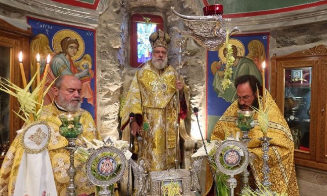 Ο Σεβασμιώτατος κ. Δωρόθεος Β’, στην ομιλία του αναφέρθηκε στην είσοδο στη Μεγάλη Εβδομάδα και κάλεσε τους πιστούς ως «άκακοι Παίδες» φέροντες στα χέρια τα Βαΐα των φοινίκων να ακολουθήσουν τον Χριστό στη σταυρική αλλά και θυσιαστική πορεία προς την Ανάσταση. Ευχήθηκε σε όλους για το Άγιο Πάσχα, και, αφού συνεχάρη τους Εφημερίους για τον προευπρεπισμό του Ναού και τους ευχαρίστησε για την φιλοξενία τους, εκάλεσε, τηρώντας το έθιμο της Βαϊοφόρου λιτανεύσεως εντός της Χώρας μετά τη Θεία Λειτουργία, κάτι που και εφέτος δεν πραγματοποιήθηκε, να ψάλλουν όλοι μαζί τα δημώδη τραγούδια των Βαΐων, κατά το έθος.