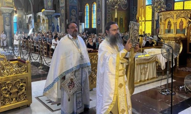 Παρά την αφόρητη ζέστη, πολλοί εκκλησιάστηκαν και γέμισαν τον Ναό, αποδεικνύοντας το φιλακόλουθο και φιλόχριστο πνεύμα των Λαρισαίων. Ο Σεβασμιώτατος στο κήρυγμα του αναφέρθηκε στην κίνηση του Χριστού να εξαναγκάσει τους μαθητές Του να μπουν στο πλοίο και να απομακρυνθούν από ανθρώπους που μπορεί να ευεργετήθηκαν από τον Χριστό μας, δεν είχαν όμως αγαθή διάθεση απέναντί Του θέλοντας να Τον εκμεταλλευθούν. Λαμβάνοντας αφορμή από τη βύθιση του Πέτρου που είχε ως αποτέλεσμα να τον μαλώσει ο Χριστός για ολιγοπιστία, τόνισε πως πολλές φορές θεωρούμε ότι η Εκκλησία βυθίζεται στη δίνη του κόσμου και προσπαθούμε να την «σώσουμε» ξεχνώντας πως η Εκκλησία σώζει εμάς κι όχι το αντίστροφο.