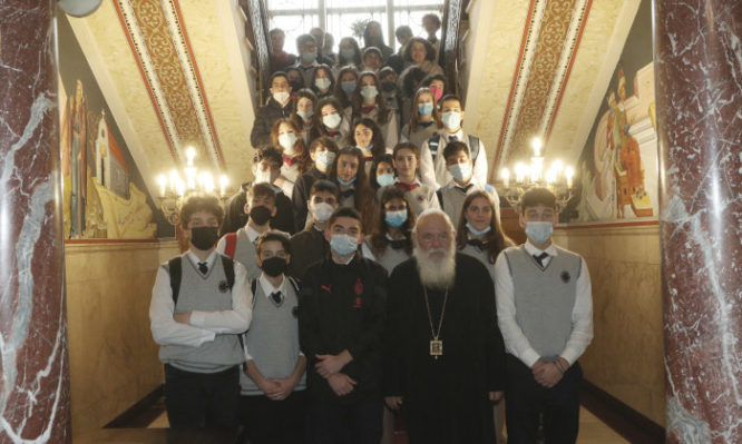 Μαθητές της Γ’ τάξης Γυμνασίου των Εκπαιδευτηρίων «Η ΘΕΟΜΗΤΩΡ» επισκέφθηκαν σήμερα το πρωί τον Αρχιεπίσκοπο Αθηνών και πάσης Ελλάδος κ. Ιερώνυμο.