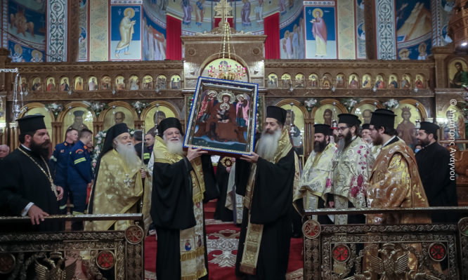 Τέλος, ο Σεβασμιώτατος κ. Συμεών εντός του Ιερού Ναού κατά την πρέπουσα εκκλησιαστική τάξη ενεθρόνισε την Ιερά Εικόνα της Παναγίας της Πεφανερωμένης στο μόνιμο Ιερό Προσκυνητάριο του Ναού, από όπου η Παναγία θα εις τον αιώνα θα ευλογεί, θα αγιάζει και θα δίδει δύναμη, ελπίδα και κουράγιο στους πιστούς, οι οποίοι θα επικαλούνται την Χάρη και την Βοήθειά Της.
