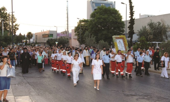 Την ιερά εικόνα κρατούσαν στα χέρια τους άνδρες του Σώματος των «Καλών Σαμαρειτών», του Ελληνικού Ερυθρού Σταυρού, ενώ παιάνιζε η μπάντα του Δήμου Αθηναίων. Την πομπή πλαισίωναν οι μυροφόρες της Εκκλησίας συνοδευόμενες από τον δραστήριο Αρχιμανδρίτη του ιερού ναού π. Τιμόθεο.