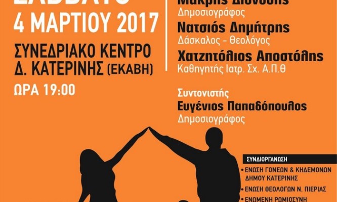 Την ημερίδα συνδιοργανώνουν οι φορείς: Ένωση Γονέων και Κηδεμόνων Δ. Κατερίνης, Ένωση Θεολόγων Ν. Πιερίας, Σύλλογος Πολυτέκνων Ν. Πιερίας, Ενωμένη Ρωμιοσύνη, Σχολή Γονέων Κατερίνης, ΓΕΧΑ Κατερίνης, Ιεραποστολικός Σύλλογος «Κυριακή». Την παρουσίαση και συντονισμό της ημερίδας την εκτελεί ο Δημοσιογράφος Ευγένιος Παπαδόπουλος.