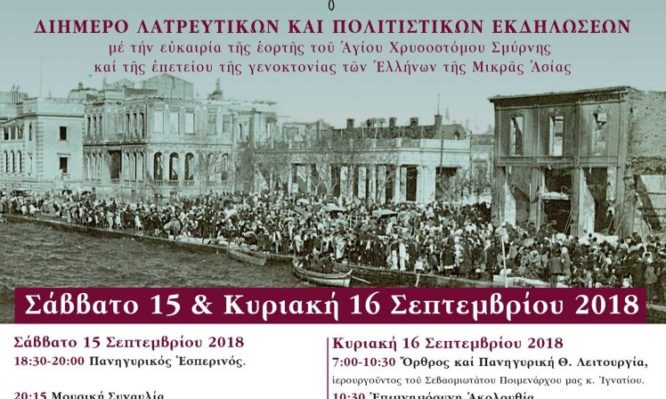 Με την ευκαιρία της εορτής του Αγίου Εθνοϊερομάρτυρος Χρυσοστόμου Σμύρνης και των συν αυτώ αναιρεθέντων κατά την Μικρασιατική καταστροφή, καθώς και της Ημέρας Εθνικής Μνήμης της Γενοκτονίας των Ελλήνων της Μικράς Ασίας, η Μητρόπολη Δημητριάδος διοργανώνει διήμερο λατρευτικών και πολιτιστικών εκδηλώσεων, με επίκεντρο τον προσφυγικό Ιερό Ναό Ευαγγελιστρίας Νέας Ιωνίας, το Σαββατοκύριακο 15-16/9. Οι εκδηλώσεις θα πραγματοποιηθούν σε συνεργασία με τους τρεις Προσφυγικούς – Μικρασιατικούς Συλλόγους «Ίωνες», «Εγγλεζονήσι» και «Μνήμες προσφύγων».