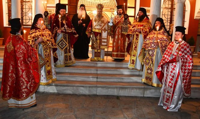 Το απόγευμα της Κυριακής της Αναστάσεως, όπως διαλαμβάνει η τάξις της Εκκλησίας στη Μητρόπολή μας, στο Παρεκκλήσιο της Παναγίας Δακρυρροούσης του Μητροπολιτικού Μεγάρου προσήλθαν ιερείς μας και αφού ανεγνώσθη τρίς η Πασχάλιος Ακολουθία ενεδύθη επισήμως ο Σεβασμιώτατος Μητροπολίτης μας κ. ΘΕΟΚΛΗΤΟΣ τα ιερά του άμφια έξωθεν του Ιερού Βήματος και εσχηματίσθη Πομπή με επικεφαλής τους Ιεροψάλτες της Αρναίας, η οποία κατέληξε στον Ιερό Ναό Αγίου Στεφάνου. Εκεί ετελέσθη ο Εσπερινός ο λεγόμενος της Αγάπης. Τον Σεβασμιώτατο πλαισίωσαν οι Παν. Αρχιμ. π. Ιγνάτιος Ριγανάς – Πρωτοσύγκελλος, π. Δωρόθεος Ζέρβας – Γενικός Αρχιερατικός Επίτροπος, π. Παΐσιος Σουλτανικάς, π. Νικόλαος Τσολούφης και π. Αμφιλόχιος Χάιτας, ο Αιδ. Πρωτ. π. Μακάριος Ζωνάρας και ο Αιδ. Οικ. π. Γεώργιος Τρικκαλιώτης. Επίσης μετείχαν και οι Διάκονοι της Μητροπόλεως π. Αθανάσιος Σφουγγάρος, π. Νικόδημος Κωτινούδης και π. Νικόλαος Τσεπίσης.