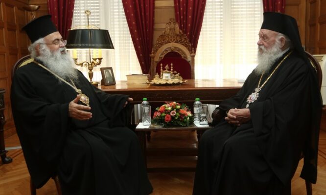 Ο Αρχιεπίσκοπος κ. Ιερώνυμος καλωσόρισε τον Αρχιεπίσκοπο κ. Γεώργιο και συζήτησαν διάφορα θέματα κοινού ενδιαφέροντος, ενώ ο κ. Γεώργιος τόνισε, μεταξύ άλλων, ότι «εκείνο που μας ταλανίζει περισσότερο είναι το εθνικό μας πρόβλημα