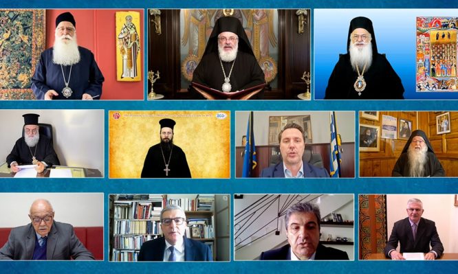Στην αρχή χαιρετισμό απηύθυναν ο εκπρόσωπος του Μακαριωτάτου Αρχιεπισκόπου Αθηνών και πάσης Ελλάδος κ.κ. Ιερωνύμου και της Ιεράς Συνόδου της Εκκλησίας της Ελλάδος, Σεβασμιώτατος Μητροπολίτης Διδυμοτείχου, Ορεστιάδος και Σουφλίου κ. Δαμασκηνός, ο Σεβασμιώτατος Μητροπολίτης Δημητριάδος και Αλμυρού κ. Ιγνάτιος, πρόεδρος της Ειδικής Συνοδικής Επιτροπής Πολιτιστικής Ταυτότητος της Ιεράς Συνόδου της Εκκλησίας της Ελλάδος, ο Δήμαρχος της Ηρωϊκής πόλεως Ναούσης κ. Νικόλαος Καρανικόλας και ο Ποιμενάρχης μας, Σεβασμιώτατος Μητροπολίτης Βεροίας, Ναούσης και Καμπανίας κ. Παντελεήμων, ο οποίος κήρυξε και την έναρξη των εργασιών του διαδικτυακού συνεδρίου.