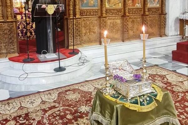 Κατά τη διάρκεια του Ιερού Αποδείπνου τέθηκε προς προσκύνηση το τεμάχιο της χειρός του Αγίου Παντελεήμονος του Ιαματικού.