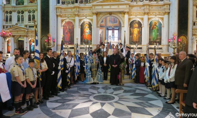 Στον Καθεδρικό Ναό του Αγίου Νικολάου τελέσθηκε το πρωι της 28ης Οκτωβρίου η Λειτουργία και εν συνεχεία η Δοξολογία στην Ερμούπολη της Σύρου.