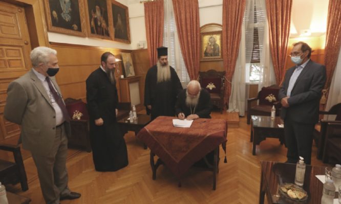 Προγραμματική σύμβαση για την παραχώρηση του κτηρίου του Βαφειαδάκειου Ιδρύματος στην περιοχή του Βύρωνα για τη λειτουργία Βρεφονηπιακού Σταθμού υπεγράφη σήμερα το πρωί από τον Αρχιεπίσκοπο Αθηνών και πάσης Ελλάδος κ. Ιερώνυμο και τον Δήμαρχο Βύρωνα κ. Γρηγόριο Κατωπόδη.