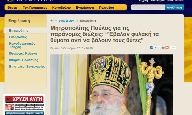Στις 20:29 στην επίσημη ιστοσελίδα της Χρυσής Αυγής αναρτήθηκε κείμενο σύμφωνα με το οποίο «Ένας από τους πλέον σεβάσμιους Ιεράρχες, ο Μητροπολίτης Γλυφάδας Παύλος, έλαβε θέση και κατήγγειλε την άδικη και αντισυνταγματική προφυλάκιση του Αρχηγού και του βουλευτή της Χρυσής Αυγής. Συγκεκριμένα χρησιμοποίησε την φράση που λέει και ο απλός λαός καθημερινά: «Έβαλαν στη φυλακή τα θύματα αντί να βάλουν τους θύτες».