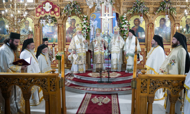 Στο πολυαρχιερατικό συλλείτουργο προεξήρχε ο Σεβασμιώτατος Μητροπολίτης Καλαβρύτων και Αιγιαλείας κ. Ιερώνυμος ενώ έλαβαν μέρος ο Σεβασμιώτατος Μητροπολίτης Δράμας κ. Δωρόθεος, ο οποίος χοροστάτησε και στον όρθρο, ο Θεοφιλέστατος Επίσκοπος Ευκαρπίας κ. Ιερόθεος και ο Σεβασμιώτατος Μητροπολίτης Βεροίας, Ναούσης και Καμπανίας κ. Παντελεήμων, ο οποίος κήρυξε και το θείο Λόγο.