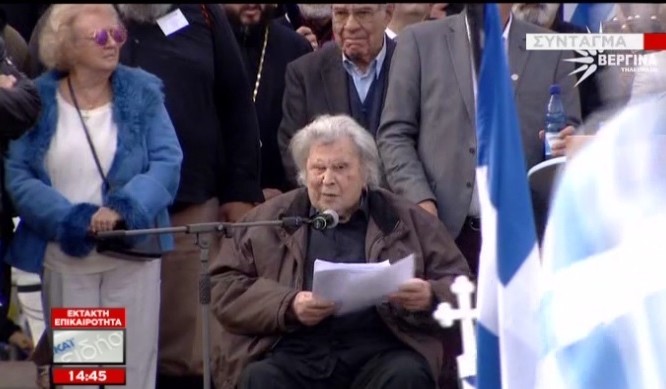 – Συγκινητικός ο Μίκης Θεοδωράκης στο συλλαλητήριο για τη Μακεδονία – «Μίκη, αλλάζεις την ιστορία» του φωνάζουν – Ξεκίνησε με τη φράση: «Αδέρφια μου, φασίστες, τρομοκράτες» – «Είμαι πατριώτης, διεθνιστής και περιφρονώ και μάχομαι τον φασισμό σε όλες του τις μορφές και στην πιο επικίνδυνη μορφή του, την αριστερόστροφη» – «Να αφήσουμε τους Σκοπιανούς να πιστεύουν στον εθνικό τους μύθο – Εμείς να παραμένουμε πιστοί και ανένδοτοι στην ελληνικότητα της Μακεδονίας» – «Νομίζουν ότι τρωμε κουτόχορτο! Με κουτοπονηριές νομίζουν ότι απευθύνονται σε λαό ηλιθίων και γονατισμένων» – «Εγώ δεν ντρέπομαι όπως οι εθνομηδενιστές που μας κυβερνούν!» – Μίλησε για μειοψηφία που κυβερνά και καταστρέφει τη χώρα και για εξτρεμιστές που είναι δειλοί τρομοκράτες – Παρόντες επίσης Αντώνης Σαμαράς, Άδωνις Γεωργιάδης και Φραγκούλης Φράγκος, Αλέξανδρος Λυκουρέζος, Παναγιώτης Ψωμιάδης – Μια… γαλανόλευκη λαοθάλασσα το Σύνταγμα! Εκατοντάδες χιλιάδες κόσμου με ελληνικές σημαίες, πανό και συνθήματα – Βουλιάζουν Βασιλίσσης Σοφίας, Αμαλίας, Σταδίου, Φιλλελήνων, Μητροπόλεως, Ερμού – Παρακολουθήστε όλα όσα συμβαίνουν στην «καρδιά» της Αθήνας.