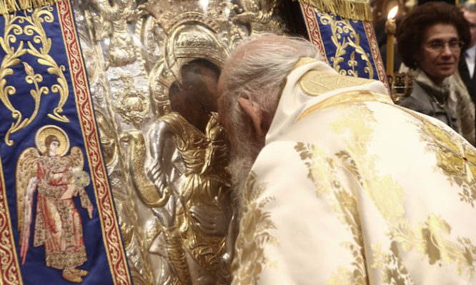 Η ιερά εικόνα της Παναγίας «Άξιον Εστι» -από τον ναό του Πρωτάτου στο Άγιο Όρος- θα παραμείνει στον Μητροπολιτικό Ναό Αθηνών μέχρι τις 15 Μαΐου.