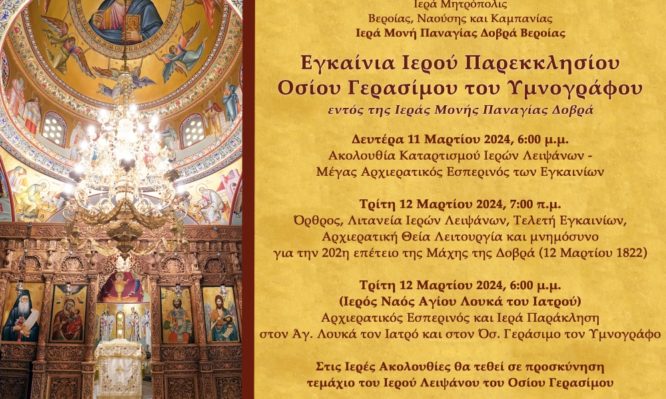 Με αισθήματα χαράς και αγαλλιάσεως η Μητρόπολη Βεροίας, Ναούσης και Καμπανίας ανακοινώνει στο χριστεπώνυμο πλήρωμα ότι κατά το διήμερο 11 και 12 Μαρτίου στην Ιερά Μονή Παναγίας Δοβρά Βεροίας θα τελεστούν τα εγκαίνια του πρώτου Ιερού Παρεκκλησίου προς τιμήν του Οσίου Γερασίμου του Υμνογράφου.