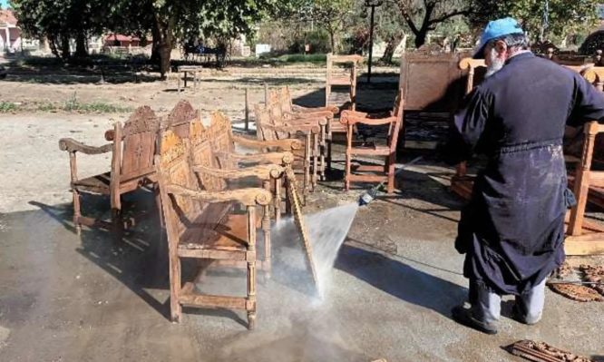 Επειδή δεν άντεχε να βλέπει την ενορία του σε αυτήν την κατάσταση, πήρε το πιεστικό μηχάνημα και με την βοήθεια των γυναικών του χωριού έβγαλε έξω όλα τα ξυλόγλυπτα και τις καρέκλες για να πιάσει δουλειά.