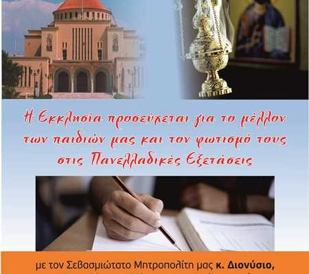 Παρακαλούνται οι υποψήφιοι των Πανελλαδικών Εξετάσεων, οι γονείς, οι συγγενείς τους, καθώς και ο πιστός Λαός να προσέλθουν και να συμπροσευχηθούν για την ενίσχυση, τον φωτισμό και την επιτυχία των παιδιών μας!