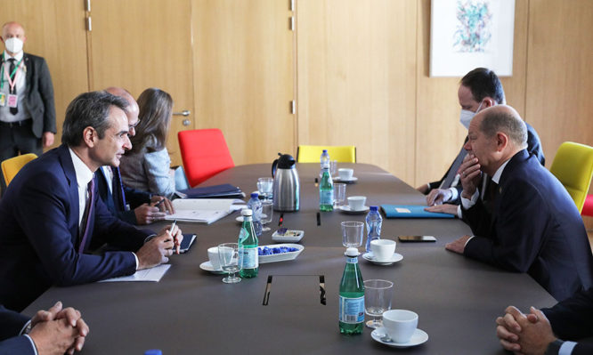 ΒΡΥΞΕΛΛΕΣ – ΑΝΤΑΠΟΚΡΙΣΗ. Χάρτη της «Γαλάζιας Πατρίδας» έδειξε στον Γερμανό καγκελάριο Ολαφ Σολτς ο Κυριάκος Μητσοτάκης, κατά την πρωινή συνάντησή τους χθες στο περιθώριο της Συνόδου Κορυφής της Ε.Ε. Ο πρωθυπουργός, σύμφωνα με κυβερνητικές πηγές, ενημέρωσε τον κ. Σολτς αναλυτικά για τις παραβιάσεις του ελληνικού εναέριου χώρου από την Τουρκία και για την επιθετική ρητορική της Αγκυρας. Οι δύο ηγέτες συζήτησαν επίσης για τη στήριξη στην Ουκρανία απέναντι στη ρωσική εισβολή και για την ενεργειακή κρίση.