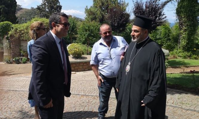 Ο κ. Μυλωνάκης σσυνοδευόμενος από συνεργάτες του έφθασε στη Θεολογική Σχολή της Χάλκης, όπου έγινε δεκτός από τον Καθηγούμενο, Θεοφιλέστατο Επίσκοπο Αραβισσού κ. Κασσιανό και την περί αυτόν αδελφότητα.