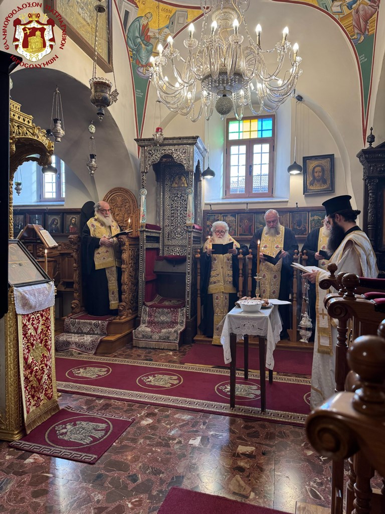 Τό ἑσπέρας τῆς Παρασκευῆς, 8ης / 21ης Φεβρουαρίου 2025, εἰς τόν Κεντρικόν μοναστηριακόν Ναόν τῶν Ἁγίων Κωνσταντίνου καί Ἑλένης καί εἰς τό πλαίσιον τοῦ Ψυχοσαββάτου τοῦ Τριῳδίου, μετά τήν Ἀκολουθίαν τοῦ Ἑσπερινοῦ ἐψάλη ὁ Κατανυκτικός νεκρώσιμος Κανών ὑπέρ ἀναπαύσεως τῶν ψυχῶν τῶν ἀοιδίμων Πατριαρχῶν, μακαριστῶν Ἀρχιερέων, Ἱερέων, Ἱεροδιακόνων καί μοναχῶν, μελῶν τῆς Ἁγιοταφιτικῆς Ἀδελφότητος, προεξάρχοντος τοῦ Μακαριωτάτου Πατρός ἡμῶν καί Πατριάρχου Ἱεροσολύμων κ.κ. Θεοφίλου, συνιερουργούντων τῶν Ἁγιοταφιτῶν Ἀρχιερέων καί Ἱερέων, ἔνθα ἐδιαβάσθησαν τά κόλλυβα τοῦ πρώτου ἐτησίου Ψυχοσαββάτου.