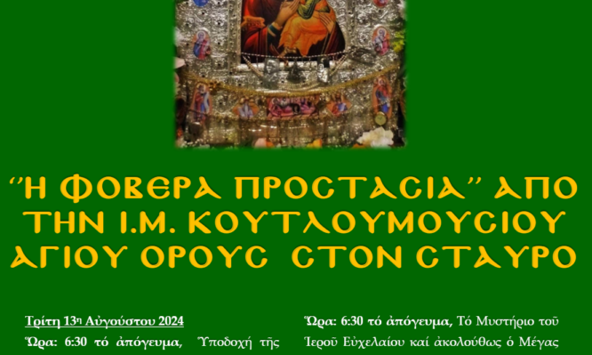 H Ιερά μας Μητρόπολη με πολλή χαρά αναγγέλλει την έλευση της Περιπύστου Εικόνος της Θεομήτορος ”ΠΑΝΑΓΙΑ Η ΦΟΒΕΡΑ ΠΡΟΣΤΑΣΙΑ”, από την Πάνσεπτο Ιερά Μονή Κουτλουμουσίου του Γεραρού Άθωνος, στον υπό ανέγερση Ιερό Ναό Οσίου Αυξεντίου Κάτω Σταυρού, την Τρίτη 13η Αυγούστου 2024, στις 6:30 το απόγευμα.