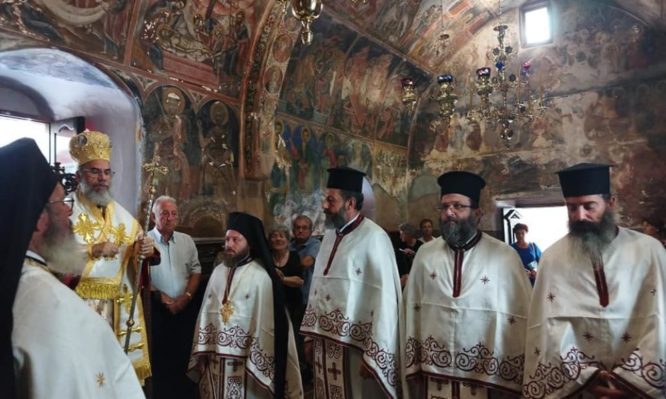 Σήμερα τό πρωΐ, κυριώνυμος ἡμέρα τῆς ἑορτῆς, ὁ Σεβ. Μητροπολίτης μας κ. Χρυσόστομος, χοροστάτησε στόν Ὄρθρο καί τέλεσε τήν Θεία Λειτουργία, ὁμοίως στήν πανηγυρίζουσα Ἱ. Μονή «Μεγάλου Σωτῆρος». Συλλειτούργησαν ὁ Πανοσιολ. Καθηγούμενος τῆς κυριάρχου Μονῆς Ἀρχιμανδρίτης τοῦ Οἰκουμενικοῦ Θρόνου π. Ἀντώνιος Πατρός, ὁ Πανοσιολ. Ἀρχιμανδρίτης π. Δαμασκηνός Κασσώτης, ὁ Ἐφημέριος τῆς Ἐνορίας Εὐαγγελισμοῦ Σύμης π. Ἀντώνιος Μανιᾶς, ὁ Ἐφημέριος τῆς Ἁγίας Τριάδος Σύμης π. Γεώργιος Χατζηχρυσάφης καί ὁ Ἱεροδιάκονος π. Παῦλος Τερεζάκης. Ἐν δέ τῷ τέλει προέστη τοῦ Κτιτορικοῦ Μνημοσύνου, ὑπέρ ἀναπαύσεως τῶν ψυχῶν τῶν προαναπαυσαμένων Πατέρων καί Ἀδελφῶν τῆς ἱστορικῆς ταύτης Μονῆς.