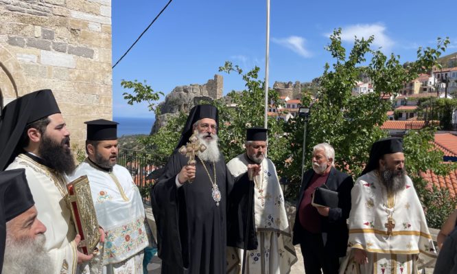 Μετά την Θεία Λειτουργία πραγματοποιήθηκε λιτανεία με τις κάρες των Αγίων στα γραφικά σοκάκια της Χώρας. Η λιτανεία σταμάτησε στο σπίτι ενός εκ των Πέντε Αγίων και τελέσθηκε δέηση για την ανομβρία. Έπειτα, ο Ποιμενάρχης μας ευλόγησε κόκκινα πασχαλινά αυγά και τα μοίρασε στους πιστούς ως ευλογία.