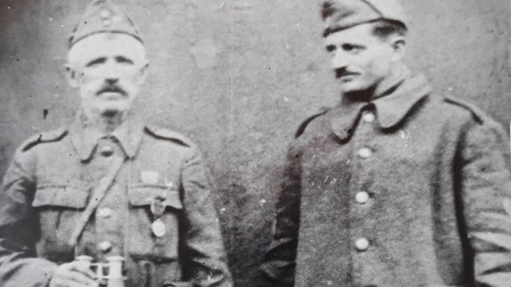 Φωτογραφίες – λεζάντες : Συνάντηση πατέρα και γιού τον Μαρτιο 1941 στην Κορυτσά, ο λοχίας Αχιλλέας Γκούμας σε δυο φωτογραφίες και ο «παππους» με το μεταλλικο μπαστουνι του σκι- λάφυρο απο Ιταλούς αλπινιστές