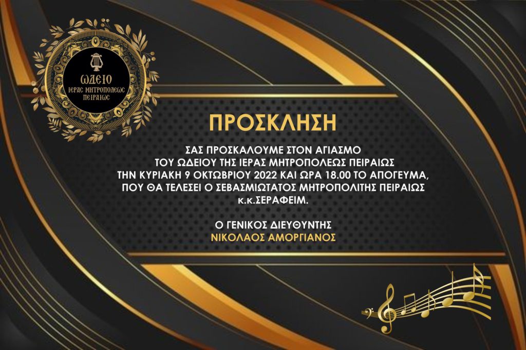 Με πολλή χαρά το Ωδείο της Ιεράς Μητροπόλεως Πειραιώς προσκαλεί τον φιλόμουσο κόσμο, γονείς, αλλά και σπουδαστές, στον Αγιασμό που θα τελέσει ο Σεβασμιώτατος Μητροπολίτης Πειραιώς κ.κ.Σεραφείμ, την Κυριακή 9 Οκτωβρίου 2022 και ώρα 18.00 στις εγκαταστάσεις του Μουσικού μας Ιδρύματος επί της οδού Μπούρμπαχη 24 Αγία Σοφία Πειραιώς. Θα ακολουθήσει ξενάγηση στους χώρους διδασκαλίας του Ωδείου, ενώ θα υπάρχει η δυνατότητα επικοινωνίας με τους καθηγητές και την Διεύθυνση του Ωδείου, εν όψει των νέων προγραμμάτων σπουδών, από ειδικούς επιστήμονες Μουσικούς του Μητροπολιτικού μας Ωδείου.