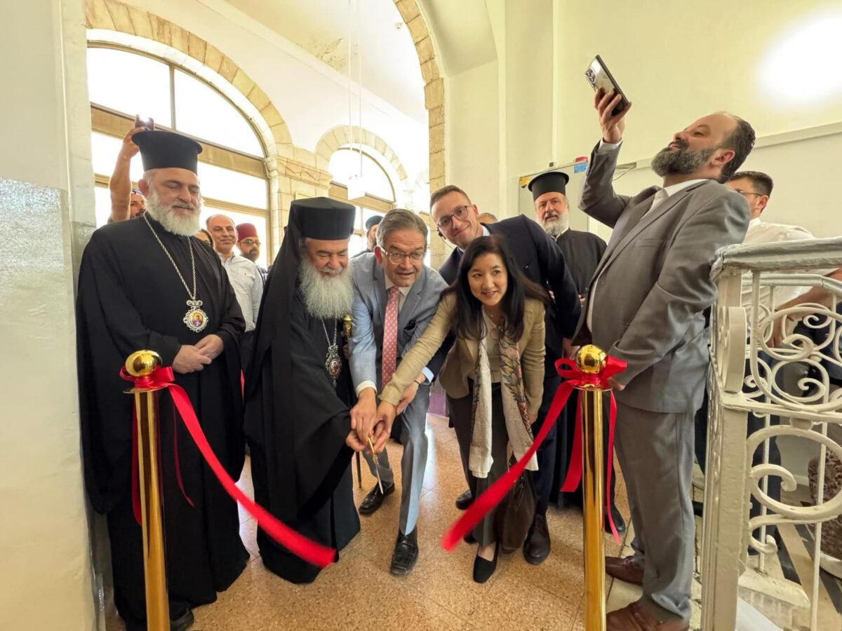 Ὑπό τήν ὑψηλήν αἰγίδα τῆς Α.Θ.Μ. τοῦ Πατρός ἡμῶν καί Πατριάρχου Ἱεροσολύμων καί πάσης Παλαιστίνης καί Ἰορδανίας κ.κ. Θεοφίλου Γ΄, τῇ τιμητικῇ παρουσίᾳ τοῦ κ. Oliver Owcza, Διπλωματικοῦ Ἀντιπροσώπου τῆς Γερμανίας εἰς Ραμάλλαν, τῆς κ. Chitose Noguchi, Εἰδικῆς Ἀντιπροσώπου τοῦ Ἀναπληρωτοῦ Διοικητοῦ τοῦ Ἀναπτυξιακοῦ Προγράμματος τῶν Ἡνωμένων Ἐθνῶν (UNDP/PAPP) καί τοῦ κ. Πέτρου Ἀναγνωστάρα, Ἀναπληρωτοῦ Γενικοῦ Προξένου τῆς Ἑλλάδος εἰς τά Ἱεροσόλυμα, ἐπραγματοποιήθη ἡ τελετή τῶν ἐγκαινίων τῆς κεντρικῆς αἰθούσης τῆς Σχολῆς τοῦ Ἁγίου Δημητρίου τοῦ Πατριαρχείου εἰς τήν Παλαιάν Πόλιν τῶν Ἱεροσολύμων.