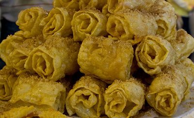 Με μία τρυπητή κουτάλα τις στραγγίζουμε και τις βάζουμε στην πιατέλα. Εκεί τις πασπαλίζουμε με τα καρυδοαμύγδαλα που έχουμε ήδη αλέσει κα ανακατέψει μαζί με το καβουρδισμένο σουσάμι και την κανέλλα σκόνη.