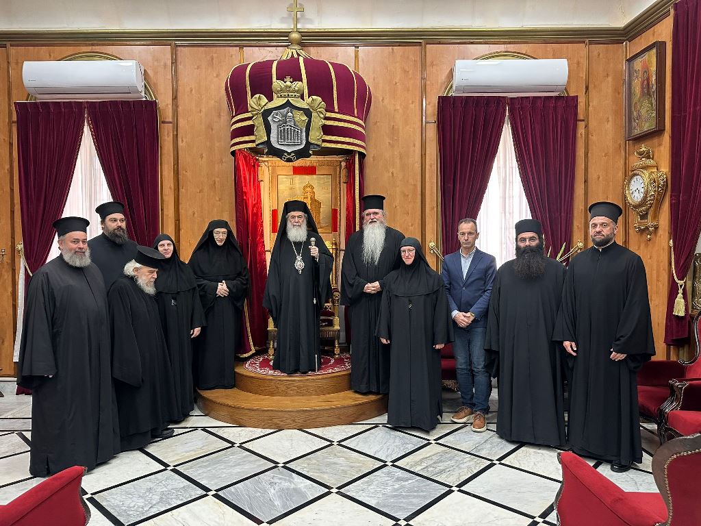 Τὴν Πέμπτην, 7ην /20ήν Νοεμβρίου 2025, ὁ Μακαριώτατος Πατήρ ἡμῶν καί Πατριάρχης Ἱεροσολύμων κ.κ. Θεόφιλος ἐδέχθη τὸν Σεβασμιώτατον Μητροπολίτην Νέας Κρήνης καὶ Καλαμαριᾶς κ. Ἰουστῖνον μετὰ τῆς καθηγουμένης τῆς γυναικείας Ἱερᾶς Μονῆς Εὐαγγελισμοῦ Ὁρμύλιας ὁσιολογιωτάτης μοναχῆς Νικοδήμης.