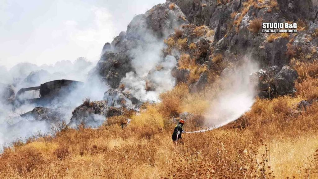 Φωτιά καίει στα Πυργιώτικα Ναυπλίου, στην Αργολίδα, που ξέσπασε το μεσημέρι της Δευτέρας 15 Αυγούστου.