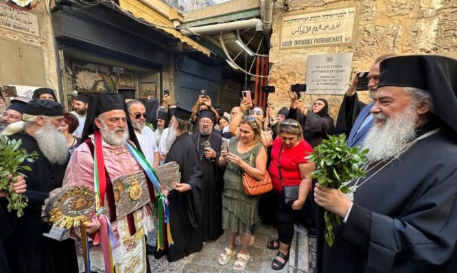 Ἡ λιτανεία ἀνῆλθε διερχομένη διά τῆς Ὁδοῦ τοῦ Μαρτυρίου καί ποιοῦσα δεήσεις ἐν ταῖς στάσεσιν τῶν Μονῶν Ἁγίου Στεφάνου, Ἁγίας Ἄννης, Πραιτωρίου, τῆς Μονῆς τοῦ Ἁγίου Χαραλάμπους καί τῆς Μονῆς Σεϊδανάγιας, καί ἔφθασεν εἰς τήν διασταύρωσιν τῆς Ὁδοῦ τοῦ Πατριαρχείου καί τῆς Χριστιανικῆς Ὁδοῦ, ἐνθα ἀνέμενεν αὐτήν ἡ Α.Θ.Μ. ὁ Πατήρ ἡμῶν καί Πατριάρχης Ἱεροσολύμων κ.κ. Θεόφιλος μετά Πατέρων Ἁγιοταφιτῶν.