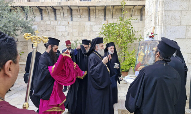 Διαρκούσης τῆς θείας Λειτουργίας προσῆλθε πρός προσκύνησιν ἡ Α.Θ.Μ. ὁ Πατήρ ἡμῶν καί Πατριάρχης Ἱεροσολύμων κ.κ. Θεόφιλος μετά Πατέρων Ἁγιοταφιτῶν.