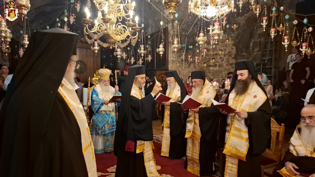 Ὅτε ἡ ἱερά πομπή ἔφθασεν εἰς Γεθσημανῆν, ὁ Μακαριώτατος ἐνεδύθη μανδύαν καί ηὐλόγησε τήν Ἁγίαν Εἴσοδον καί εὐθύς ἀμέσως ἡ συνοδεία κατηυθύνθη διά τῶν κατηφορικῶν βαθμίδων πρός τό μέσον τοῦ Ναοῦ, τῶν ψαλτῶν ψαλλόντων «Ἐν τῇ γεννήσει τήν παρθενίαν ἐφύλαξας…». Ἐνταῦθα ὁ Μακαριώτατος, οἱ Ἀρχιερεῖς καί Ἱερεῖς προσεκύνησαν τό Θεομητορικόν μνῆμα καί ἐνεδύθησαν τάς Ἀρχιερατικάς καί Ἱερατικάς αὐτῶν στολάς, ἐν ᾧ ὁ Πρωτοψάλτης τοῦ Πανιέρου Ναοῦ τῆς Ἀναστάσεως διάκονος π. Εὐστάθιος ἔψαλλε τό «Ἄνωθεν οἱ προφῆται Σέ προκατήγγειλαν…».