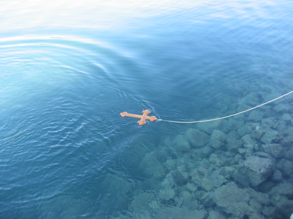 Ανήμερα των Φώτων, μετά την λειτουργία των Μεγάλων Ωρών, τελείται ο καθαγιασμός των υδάτων και η ρίψη του Τίμιου Σταυρού. Ο ιερέας ρίχνει το σταυρό μέσα στο νερό -σήμερα ο σταυρός είναι δεμένος πάνω σε σκοινί για να μη χαθεί-, και πιστοί βουτούν για να πιάσουν τον σταυρό, θεωρώντας ύψιστη τιμή, ευλογία και τύχη για όποιον τον βρει και τον πιάσει τον σταυρό. Σχεδόν σε όλα τα μέρη της Ελλάδος κατά τον καθαγιασμό των υδάτων αφήνουν ελεύθερα να πετάξουν τρία λευκά περιστέρια. Τα περιστέρια αυτά συμβολίζουν την Αγία Τριάδα, κατά την φανέρωση του Αγίου Πνευματος -εν είδη περιστεράς- όταν ο Ιησούς βαφτιζόταν στον Ιορδάνη Ποταμό.